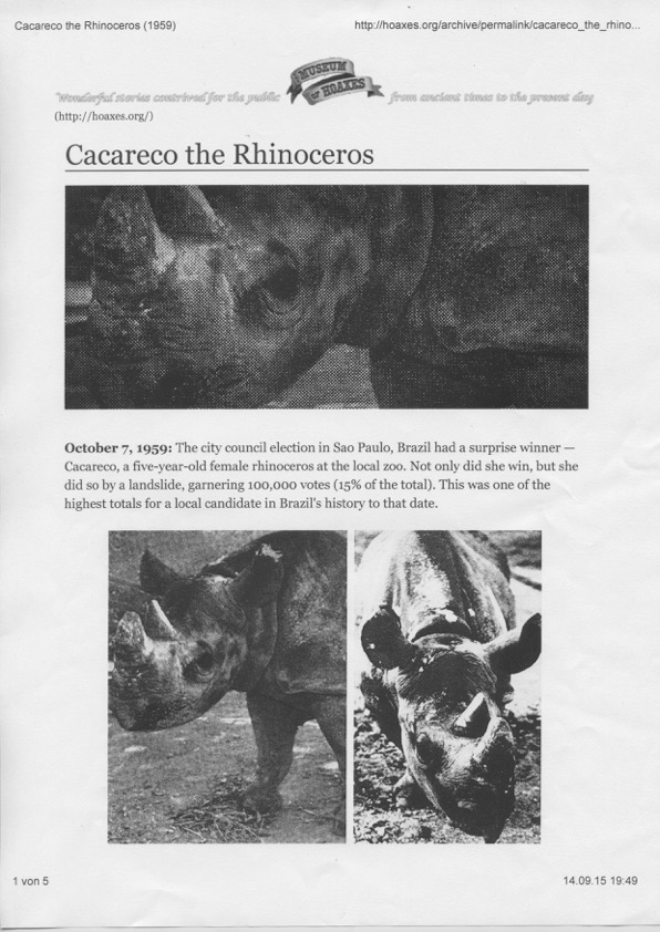93 x 93 cm is approximately half a king size bed or alternatively four sidewalk paving slabs in Brazil’s Porto Alegre. Eight of these often figure as the hard surface of a sleeping pad for a homeless person. This is the size of the floor installation Imagine there is no Rhino. A good 500 years ago, the first rhinoceros to reach Europe drowned in the Mediterranean on its way from Portugal to Pope Leo X. In the absence of the real animal, multiple prints of the rhinoceros imagined by Albrecht Dürer have in contrast survived in European archives and deeply shaped the popular image of the animal. The title refers on the one hand to John Lennon’s anti-war song, Imagine (1971), but also to the fact that Dürer had never seen a rhino.