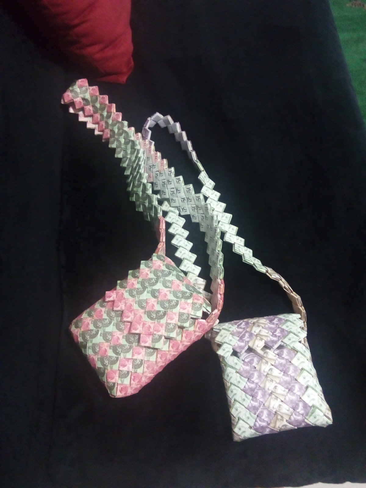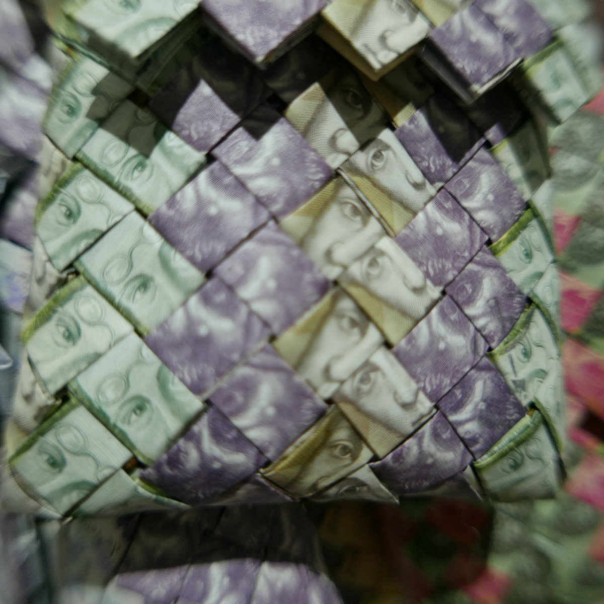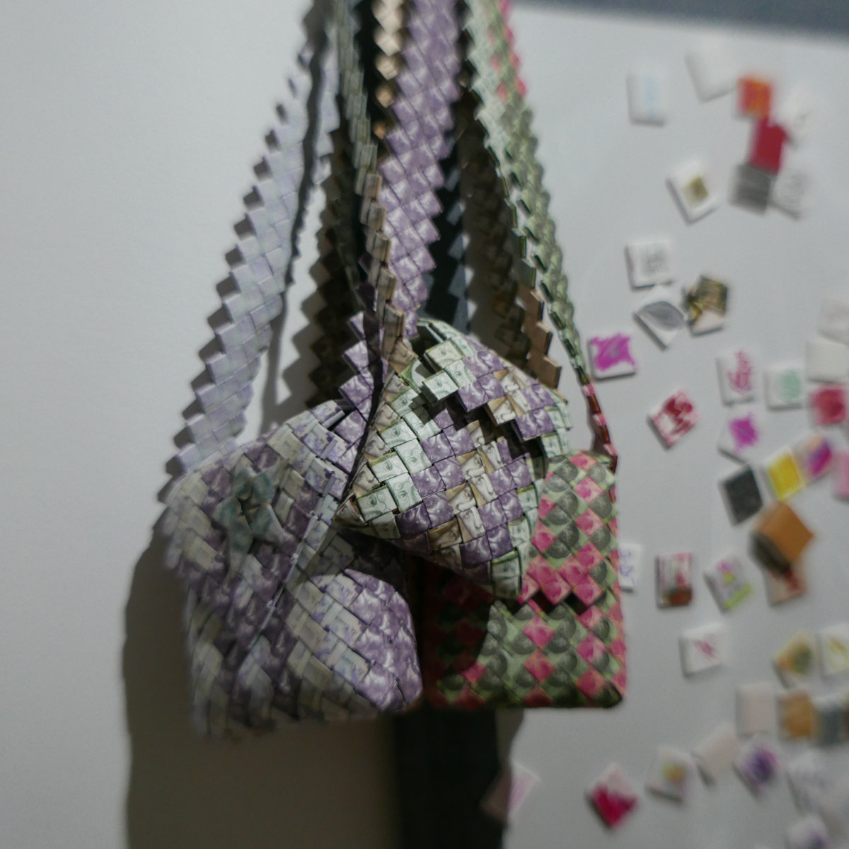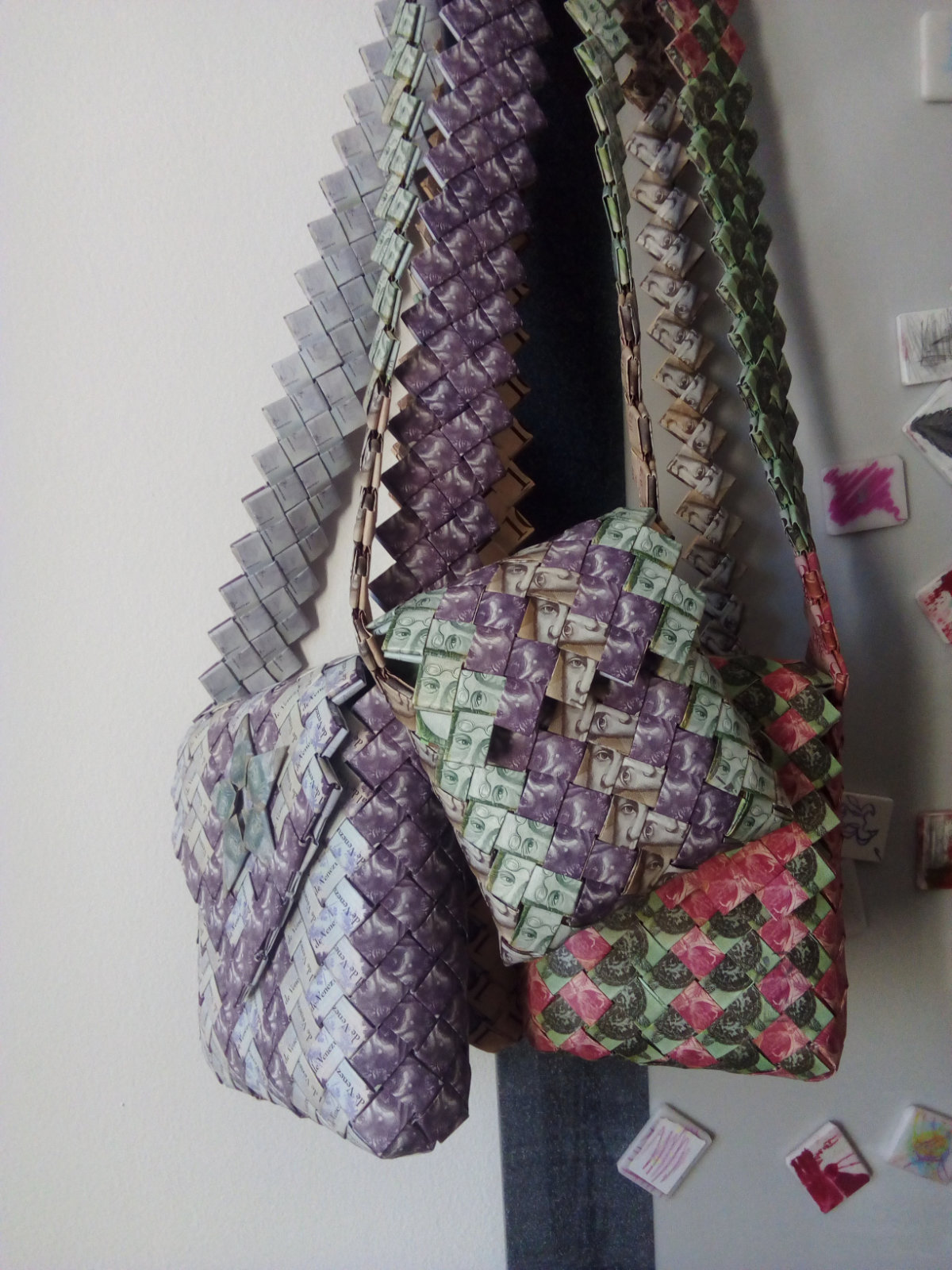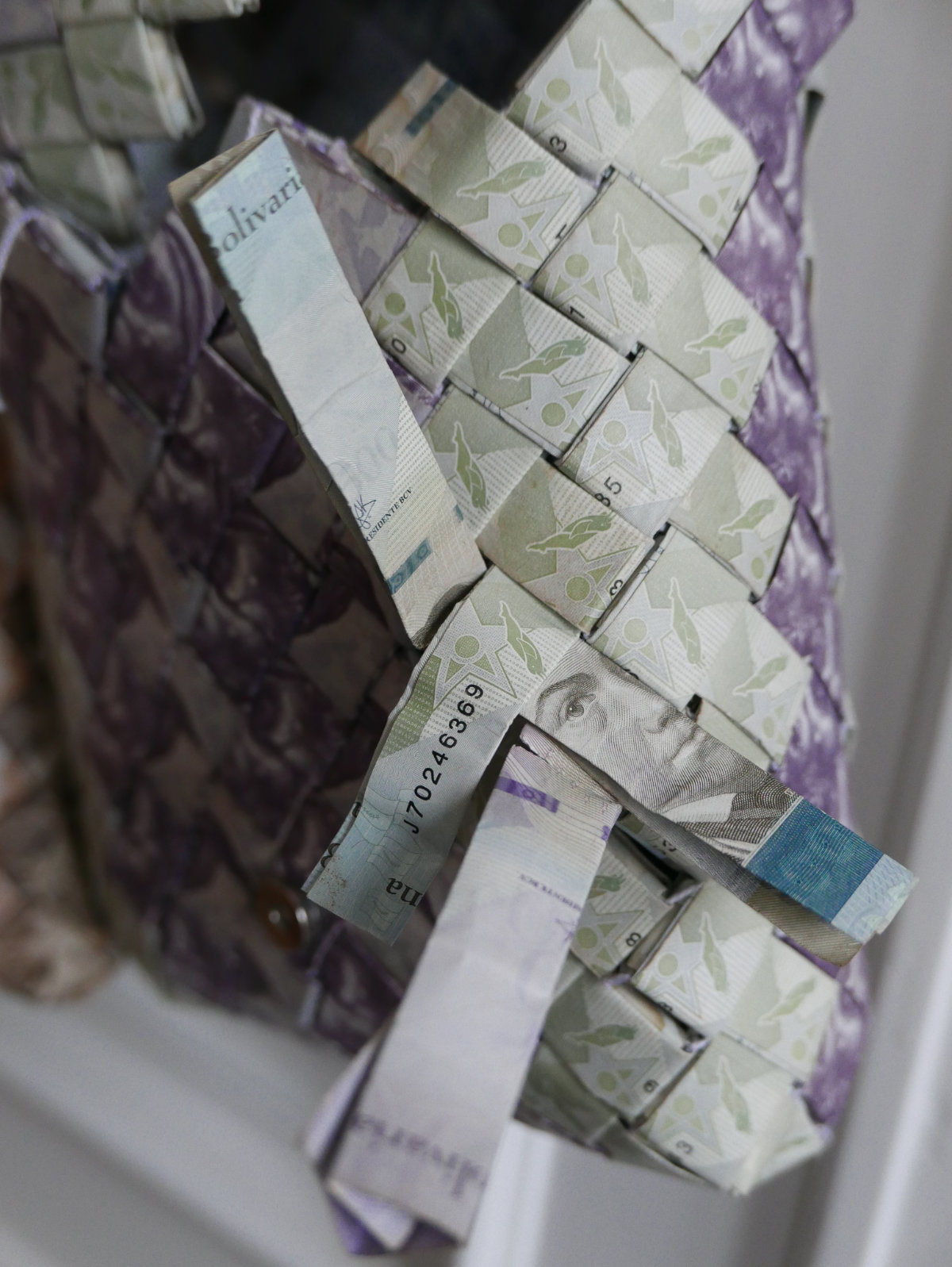 2019, in Columbia, I saw people on the streets weaving Venezuelan bolivianos (banknotes) into beautiful bags. From the first moment, I was fascinated and bought one. The next day, I ordered more. Suddenly I realized that cash can work for me. In this form, it is both information and material. Money as a medium becomes a means for transporting my glasses, my driving license, name cards, and wallet.