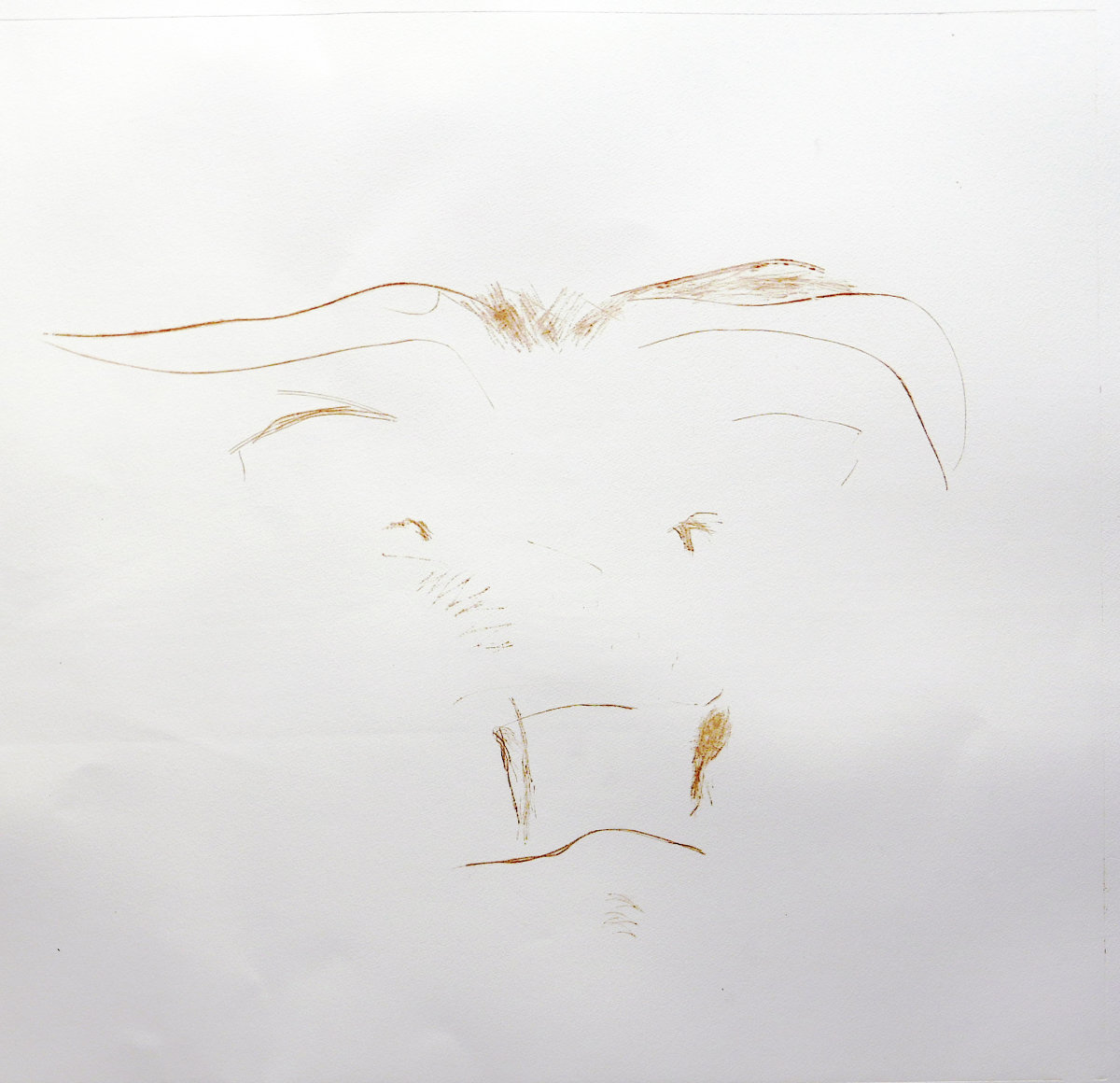 In Eugène Ionesco’s play, Rhinoceros, Daisy regrets that her friend has turned into a rhinoceros and recounts: “What he said was: we must move with the times! Those were his last human words.” A reflection on how fascism and national socialism assume their own reality, void of humanity. This phrase is seen in Ottjörg’s etching Imagine there is no Rhino (2015), which is seen hanging on another wall.