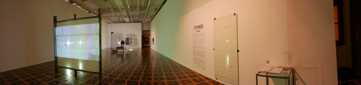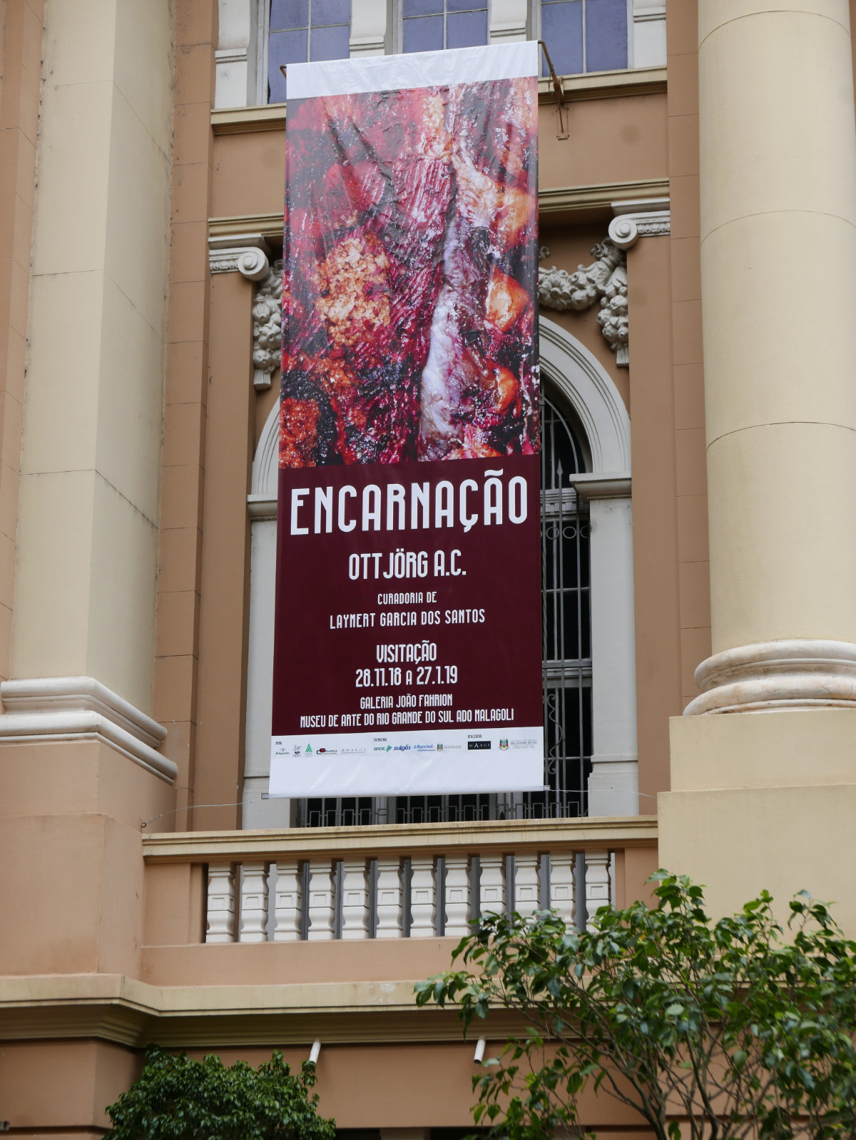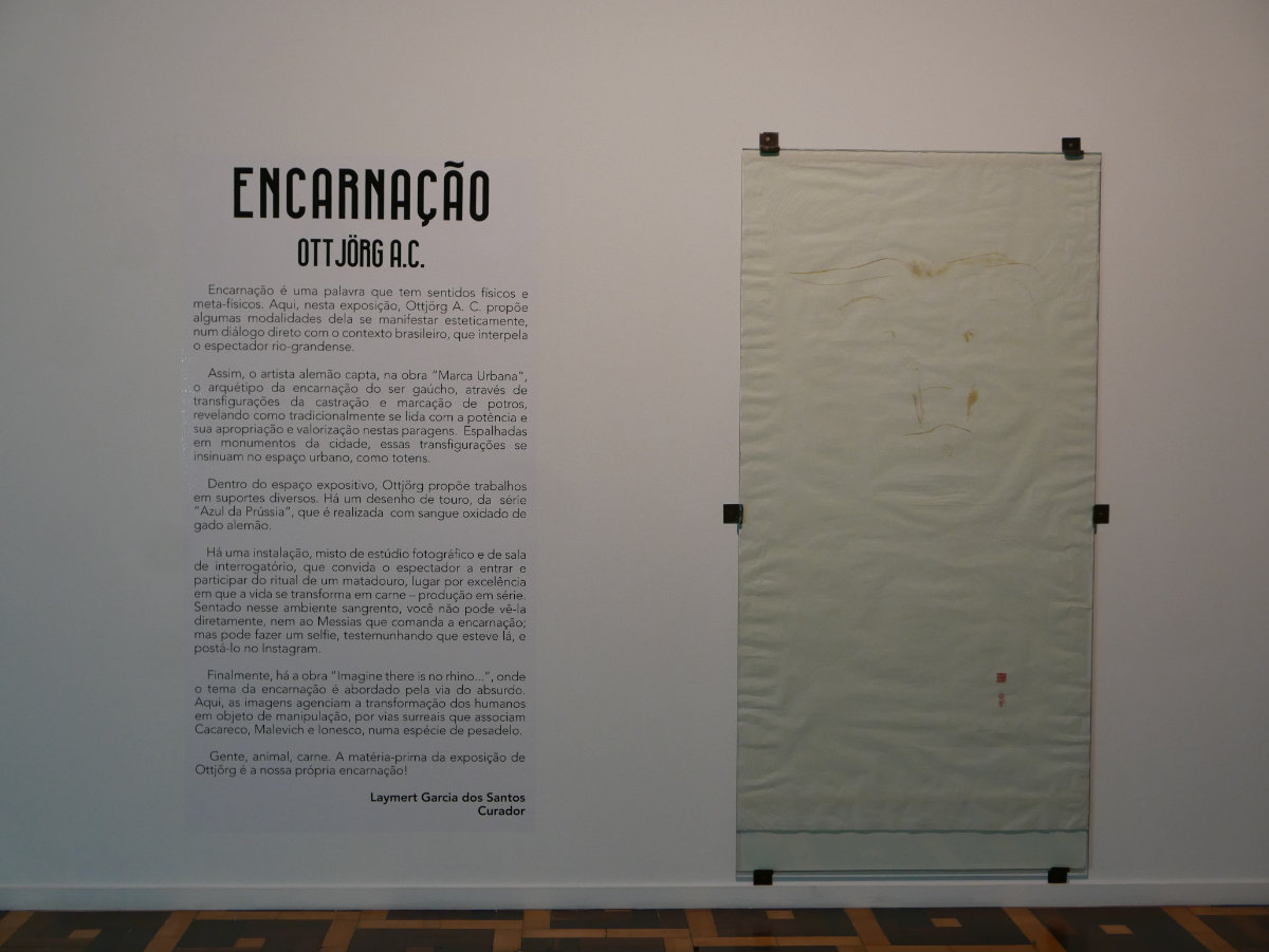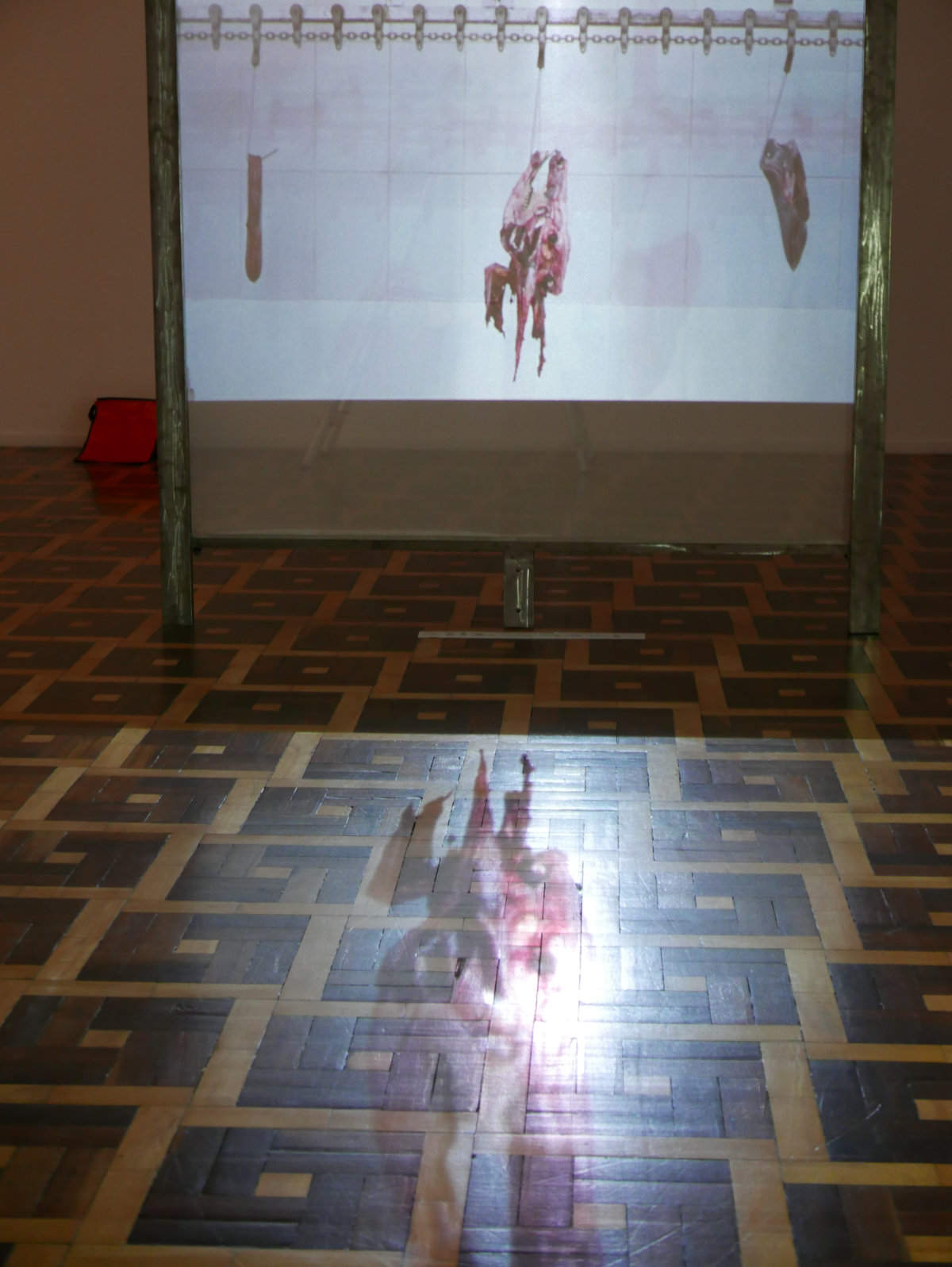 Chunks of meat hanging from a conveyor belt in a slaughterhouse are projected in slow motion across a white screen. And photographs of meat plotted on fabric hanging from a clothes’ stand that is referred to in Brazil as a macaw’s perch (pau de arara). The term is however also used to describe a common method of torture during the military dictatorship. Exhibition visitors are invited to choose a photograph as a background for selfies. Some people said that the sight of the grilled meat made their mouths water. A lamp similar to those used both in photo studios and in forced interrogation projects the shadows of the visitors onto a white wall.