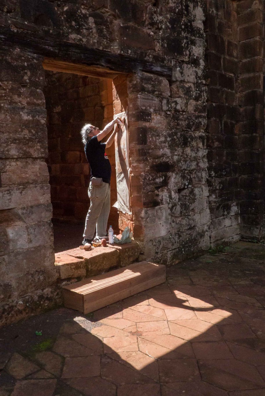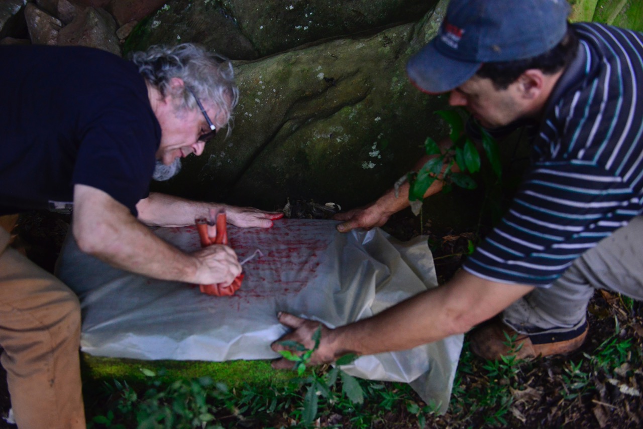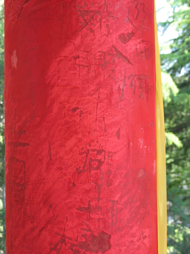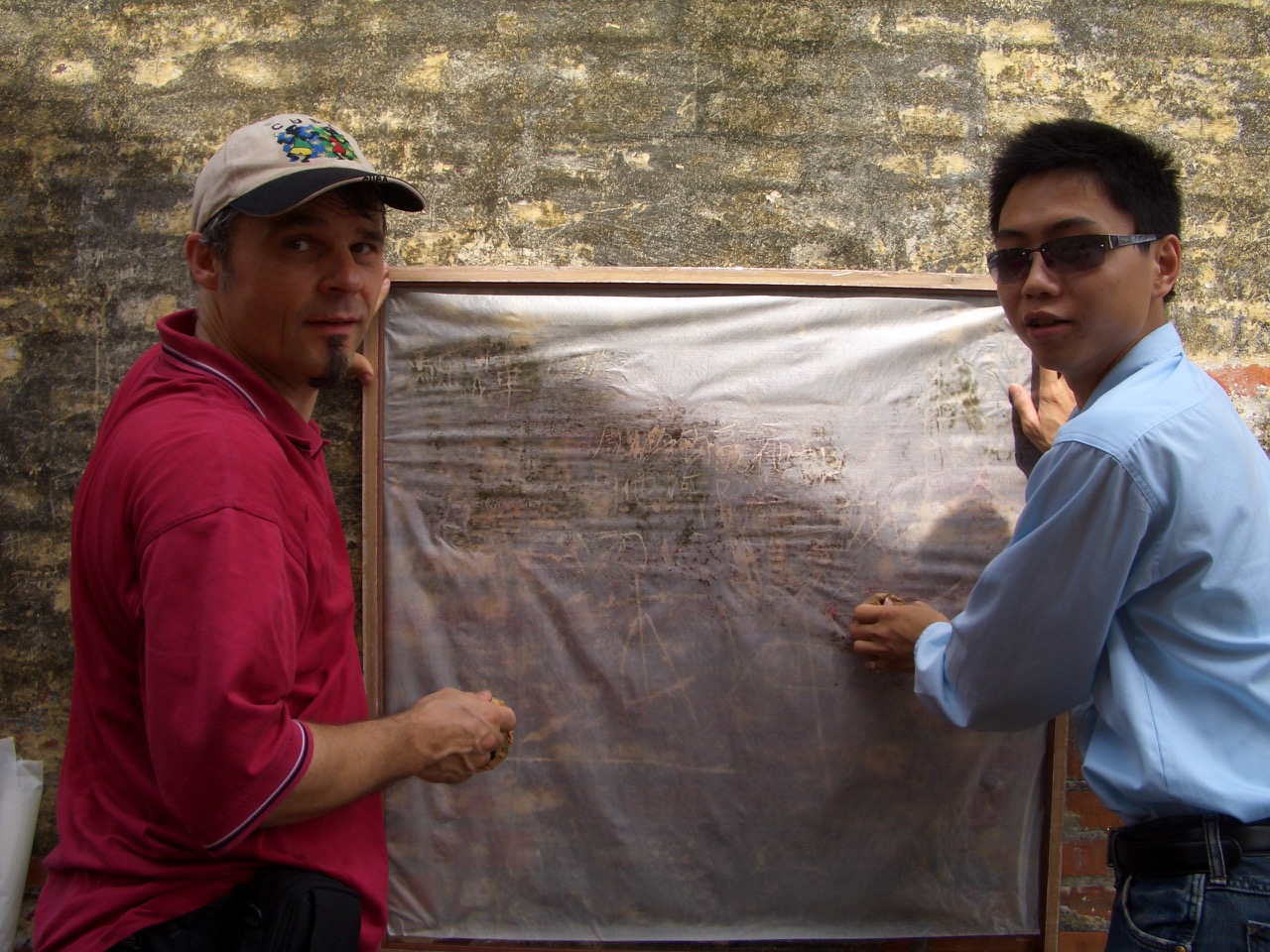 Surface structures of walls and stones are transferred onto paper or fabric using crayons and pencils, but mostly by means of a Chinese tampon technique acquired in the Palace Museum in Beijing. Often, a traditional silk specifically developed for East Asian calligraphy serves as the image support. Size and colour are adapted to on-site conditions.