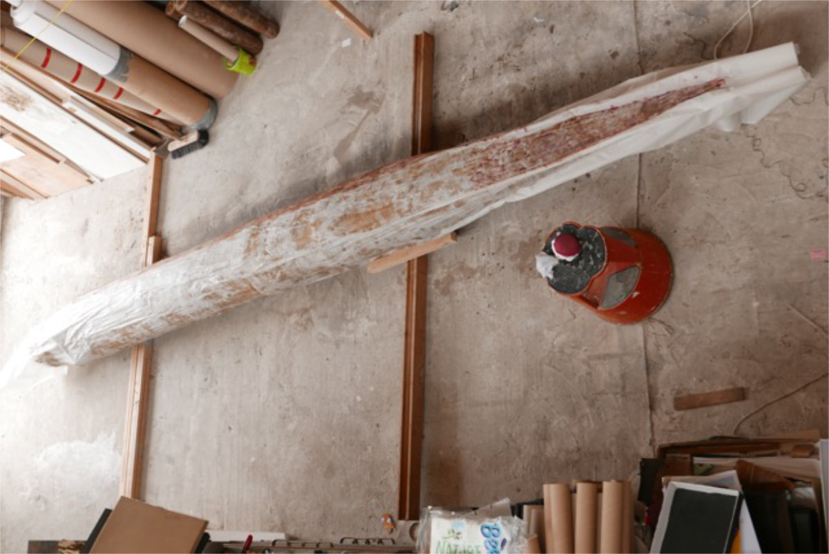 Each pile is entirely printed eight times on separate sheets. Eight prints are on Japanese white silk (four of each pile), and eight on traditional handmade paper. The silk prints are made in an Asian tampon printing process. The prints on handmade paper are realised under high-pressure, as is usual used for woodcuts. This leads to a total of sixteen large-format monotype prints in the original size of the piles.