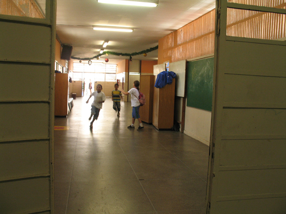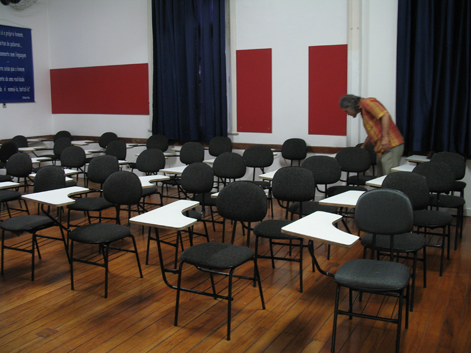 Während des dreimonatigen Zeitraums gelang es mir, 100 Schulbänke von 11 Schulen auszuleihen und die Tischplatten auf das mitgebrachte Büttenpapier zu drucken. Zu den teilnehmenden Schulen gehörten sowohl teure Privatschulen als auch öffentliche Reformschulen in sozialen Brennpunkten, zum Beispiel im Stadtviertel Jardim Angela, das als eines der gefährlichsten Brasiliens gilt. Abgerundet wurde der Aufenthalt durch ein öffentliches Gespräch mit Laymert Garcia dos Santos, Soziologe und Mitglied des Verwaltungsausschusses der Kunstbiennale von São Paulo.