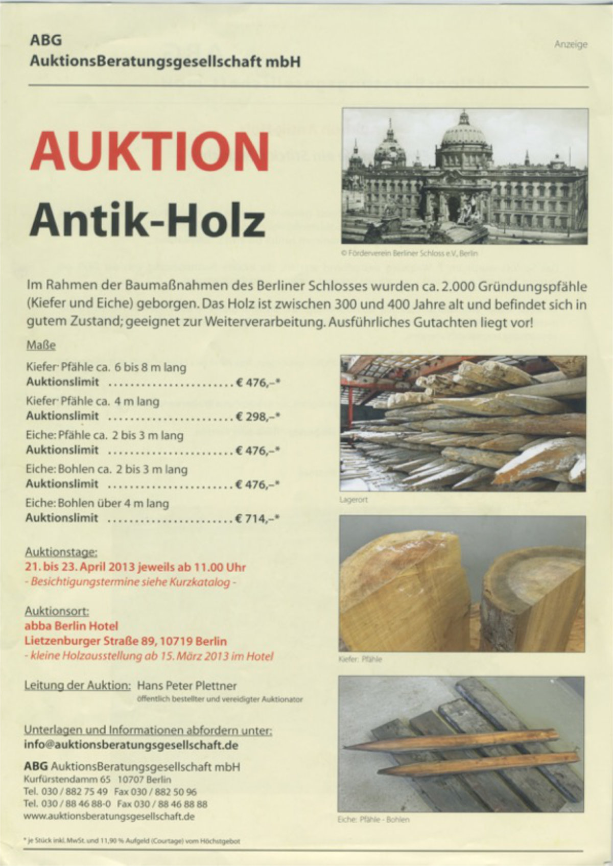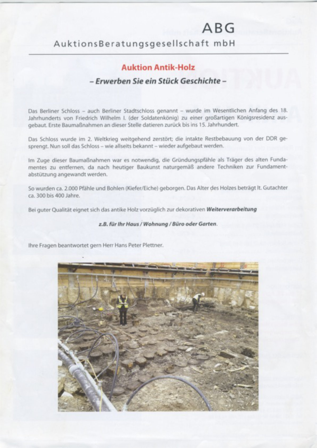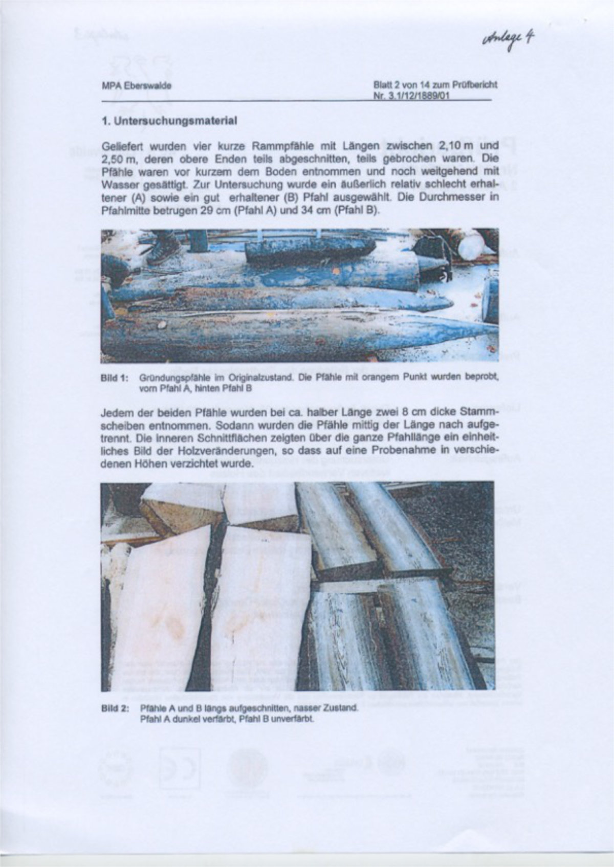 "Im Zuge dieser Erschließungsmaßnahmen mussten die alten Gründungspfähle entfernt werden, ... Das Holz ist nach Einschätzung von Experten etwa 300 bis 400 Jahre alt."
