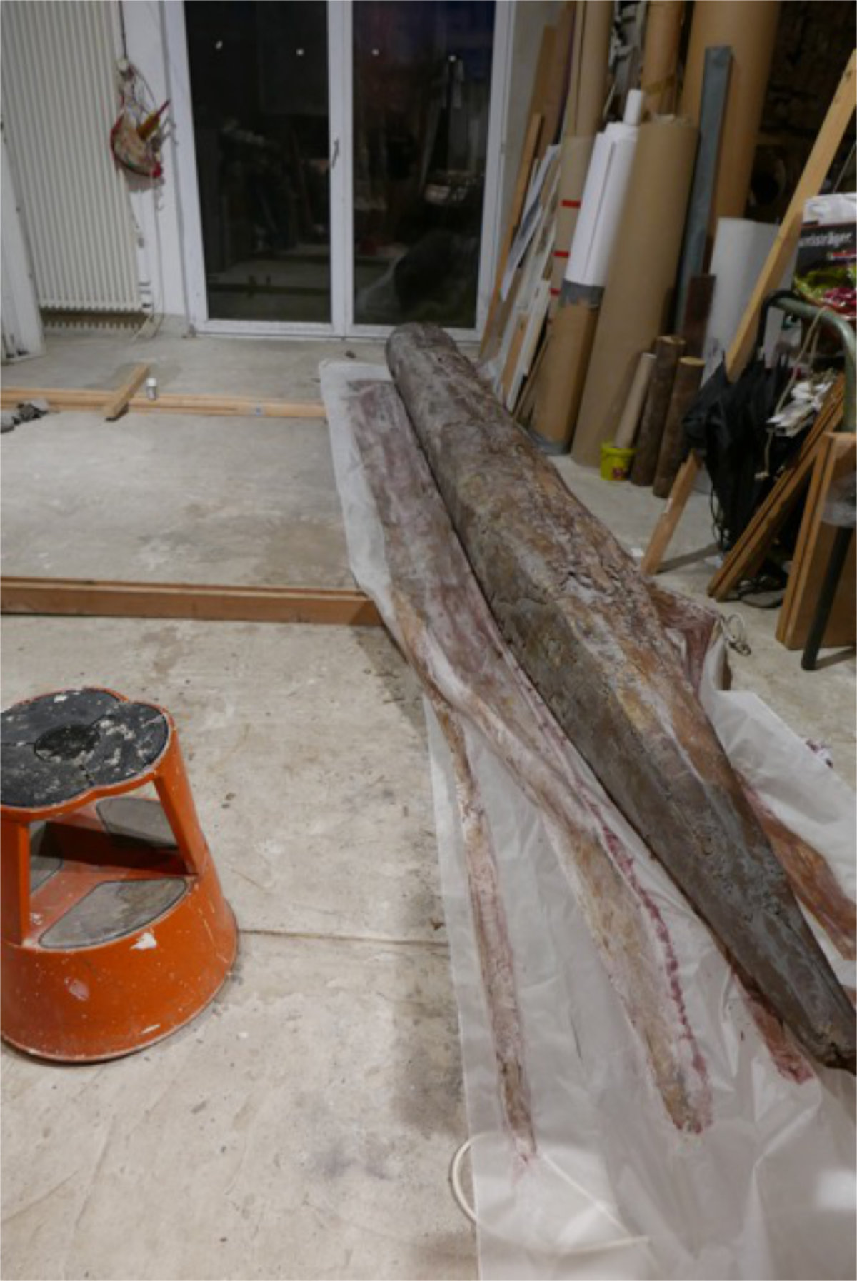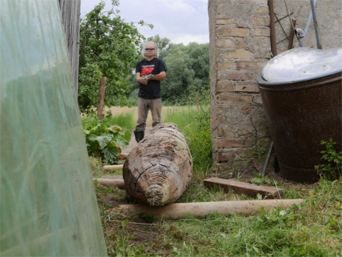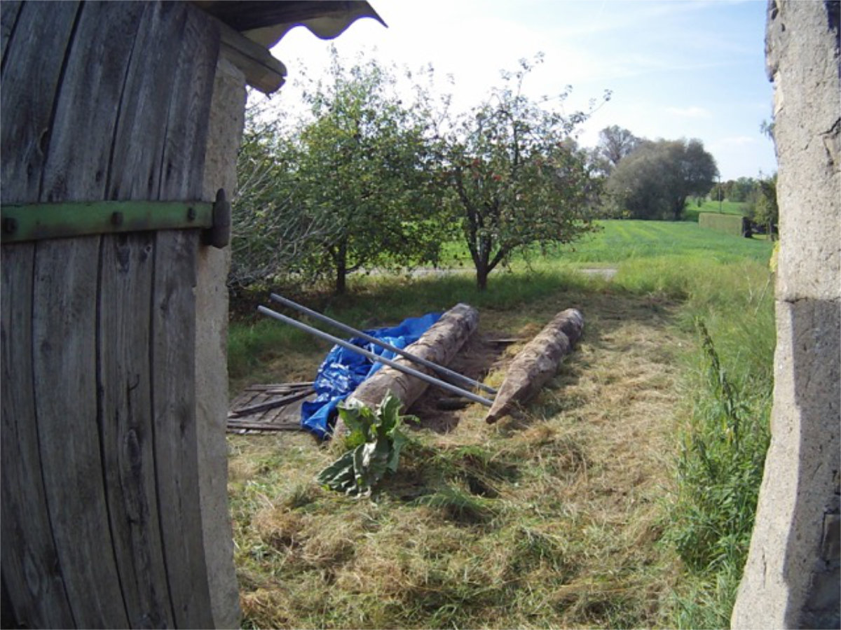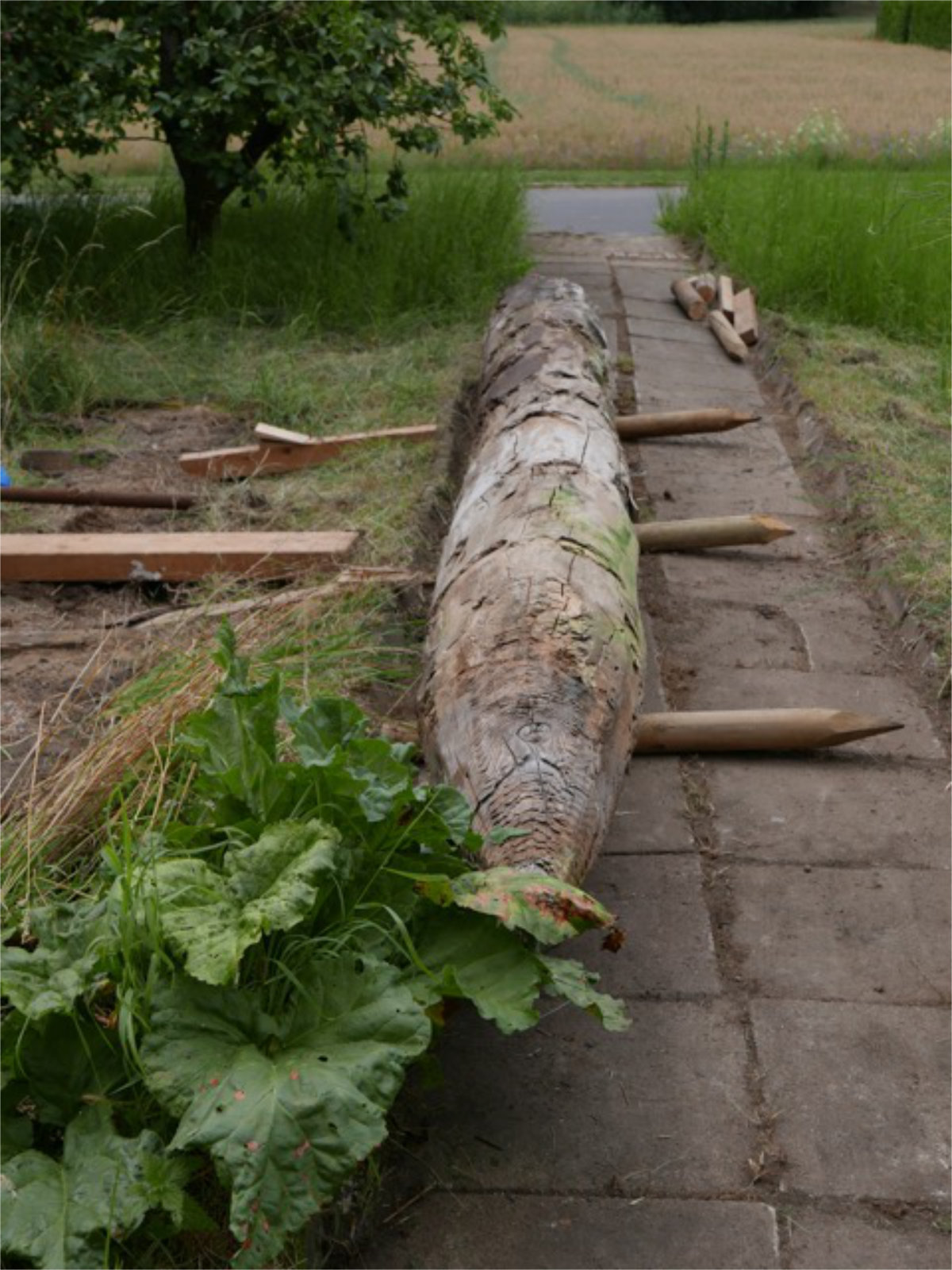 Zwei der 1707 in den Boden gerammten und 2012 entfernten Pfähle des Schlosses bilden die Druckstöcke für das Projekt: Preussisch schwarz-weiss.