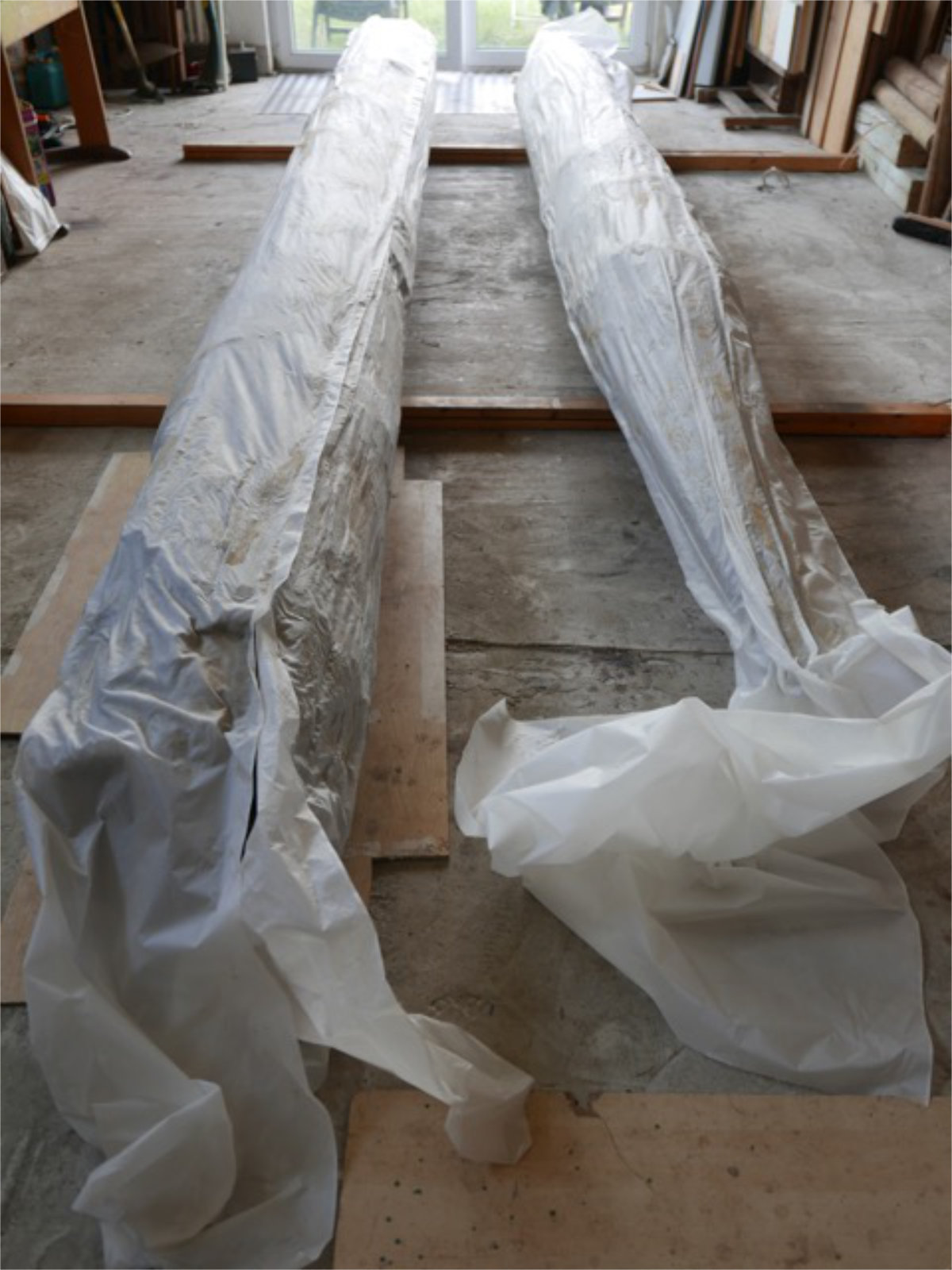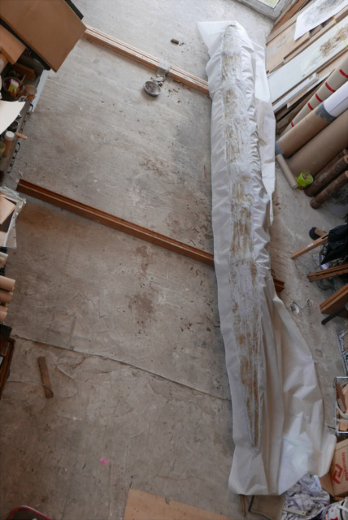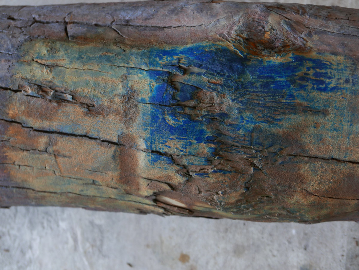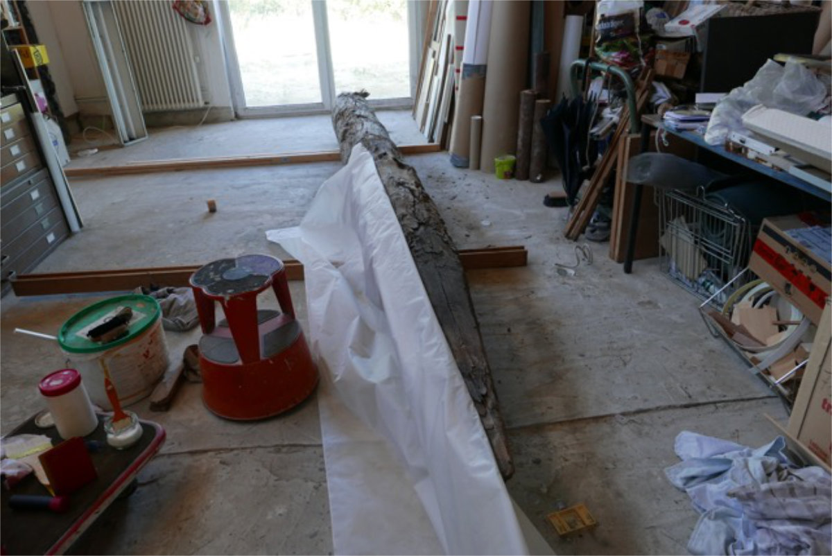 Zwei der 1707 in den Boden gerammten und 2012 entfernten Pfähle des Schlosses bilden die Druckstöcke für das Projekt: Preussisch schwarz-weiss.