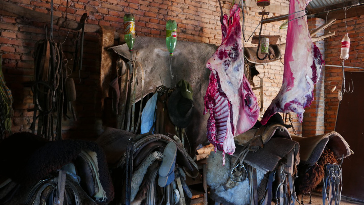 For young bulls, the marcação coincides with the castração, or castration. The animals are castrated to keep them more submissive and make their meat juicier. In the so-called castration by pocket knife, the animal’s scrotum is cut open and the testicles severed off by one of the men – and it is always the job of a man. Horses are castrated later in life because their testicles only descend into the scrotum when the colts are about one year old. To indicate the castration, i.e. the conversion of a stallion into a gelding, the tail of the animal is cropped and cut straight. This procedure embodies an archetype of our civilisation and also the primal function of a bank: appropriation and multiplication, or control determined by economic objectives.
