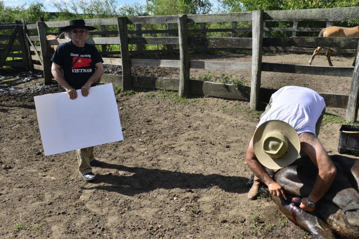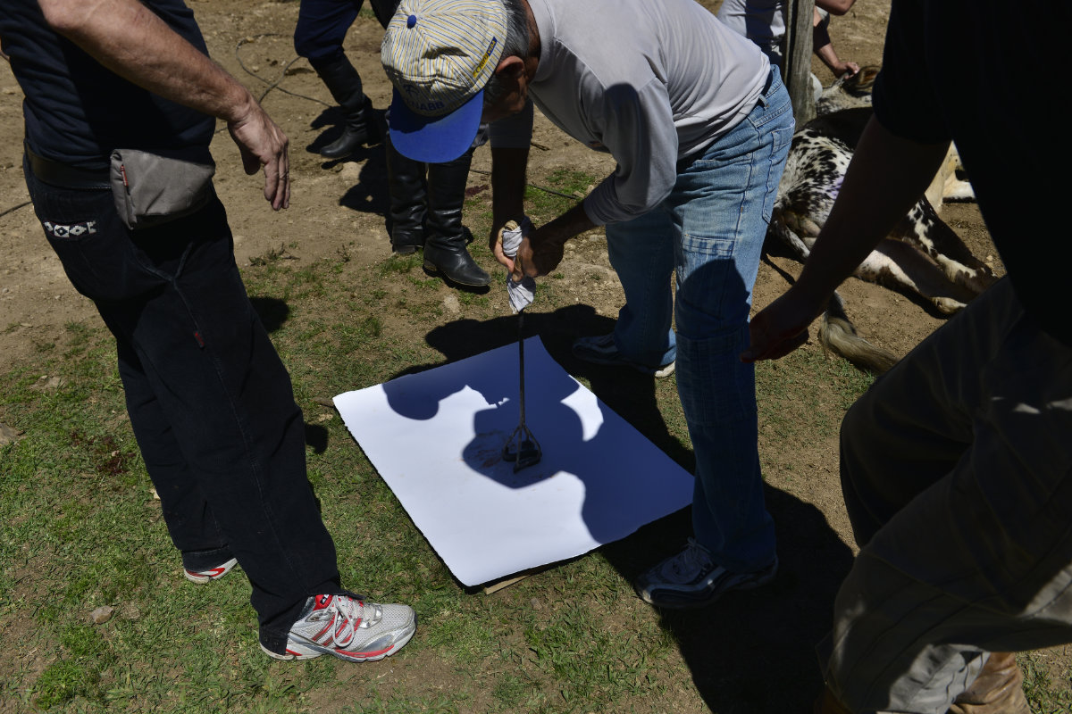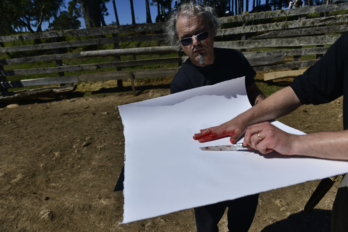 In the case of the bulls, where the marcação is done at the same time as the castração, the still hot iron is applied to the paper immediately after branding. The heat of the iron and remains of the burnt hide leave traces on the paper. As does the blood from the castrator’s knife that he wipes on the paper after having severed the testicles. Sometimes the gaúcho also leaves the imprint of his bloodstained hand on the white surface. The testicles are kept for further use in the project.