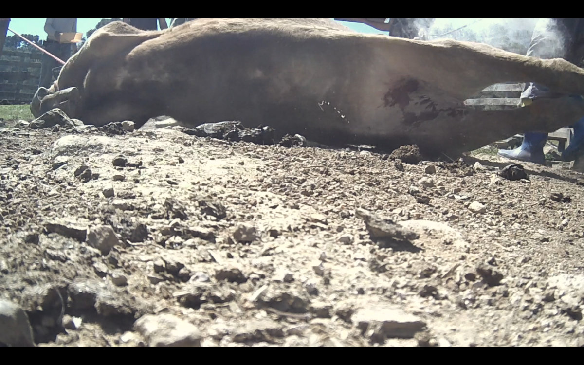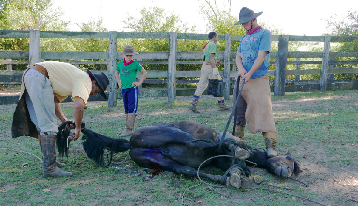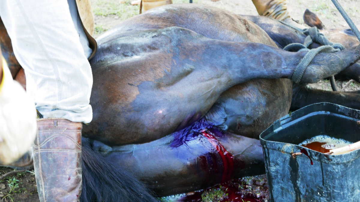 The procedure is the same for the castration of horses, except that the paper does not get branded. Here too, the testicles are kept for further use. This is easier with horse testicles since, in contrast to cattle testicles, they are not dedicated to being grilled and eaten as a delicacy. The branded sheets of paper and testicles are then transported to a printing workshop together with tail hair from the horses.