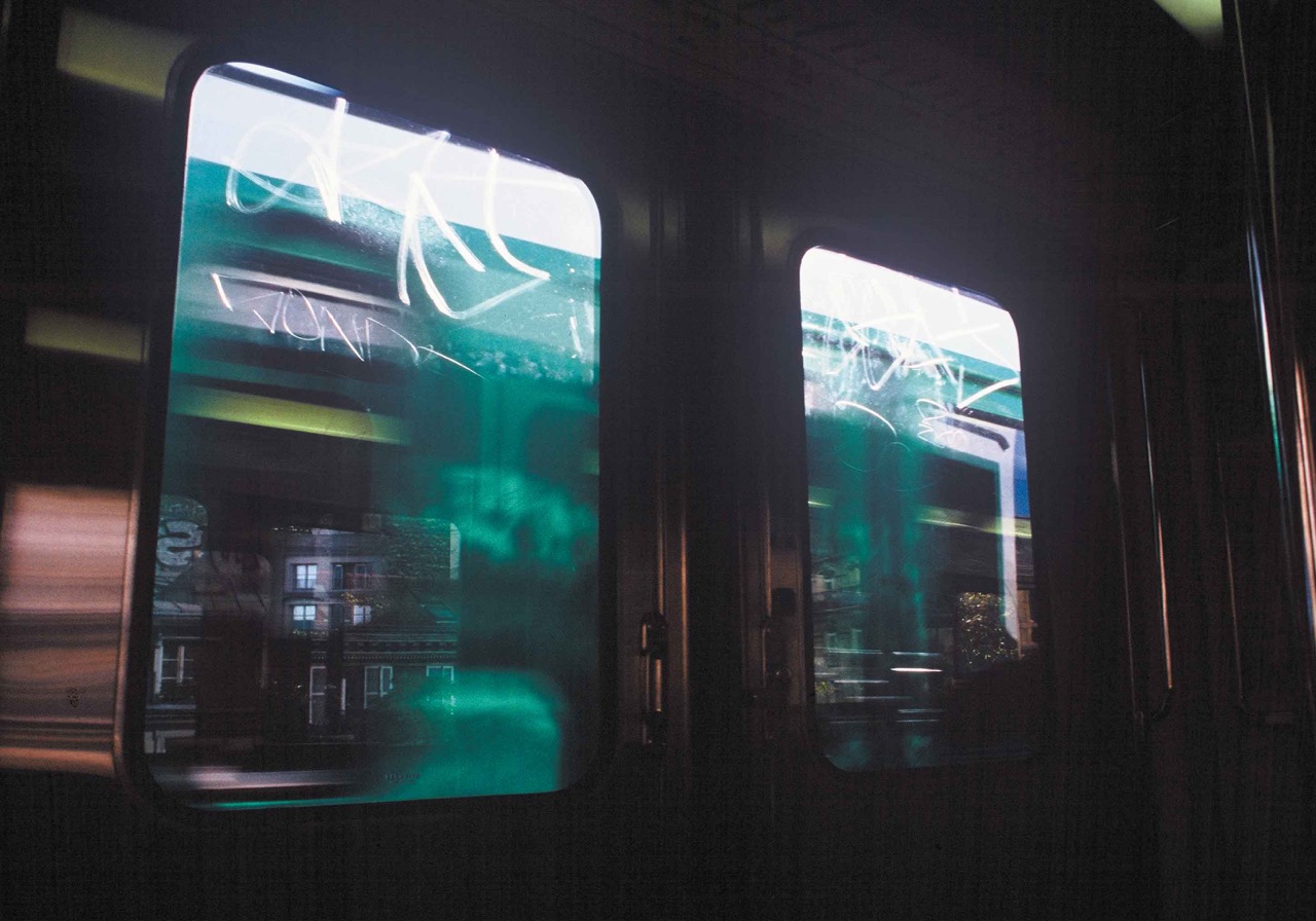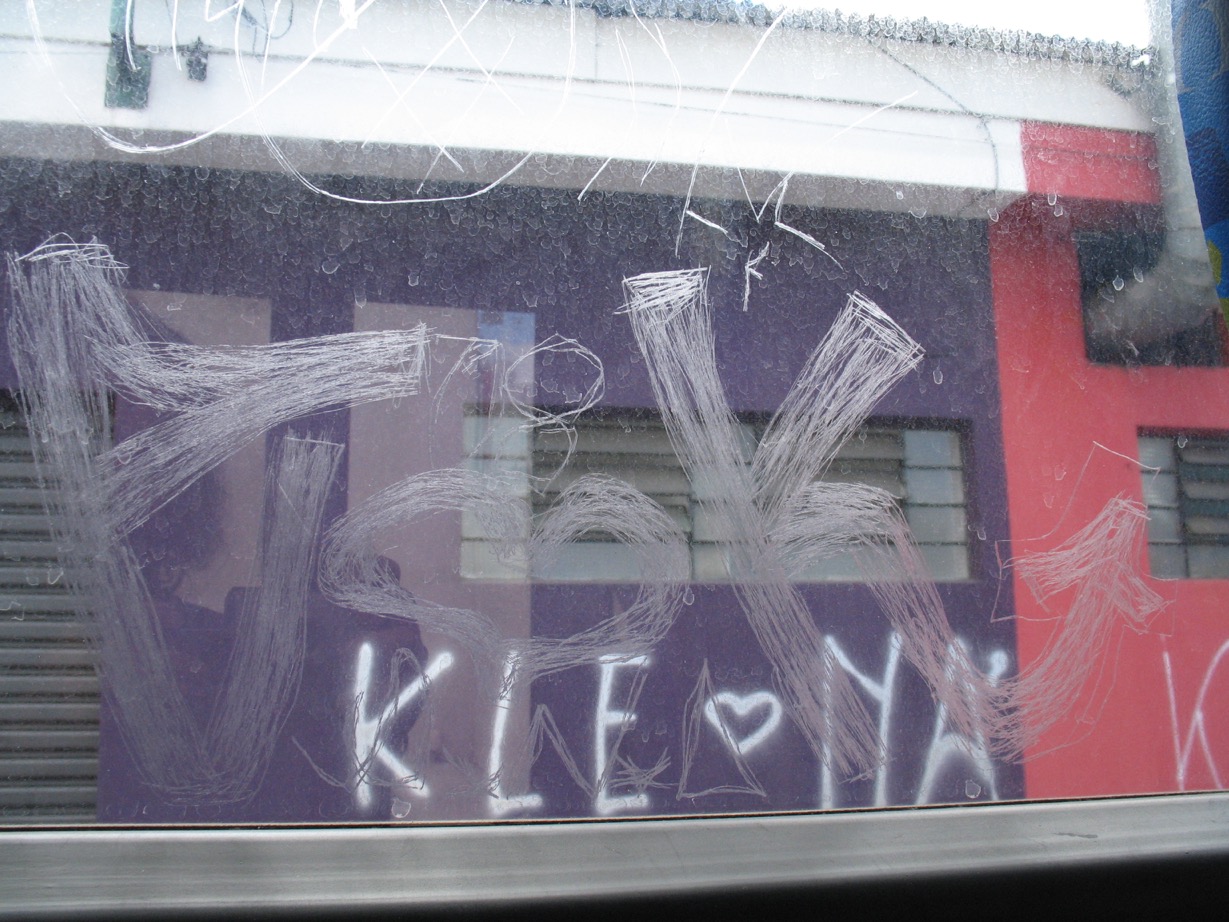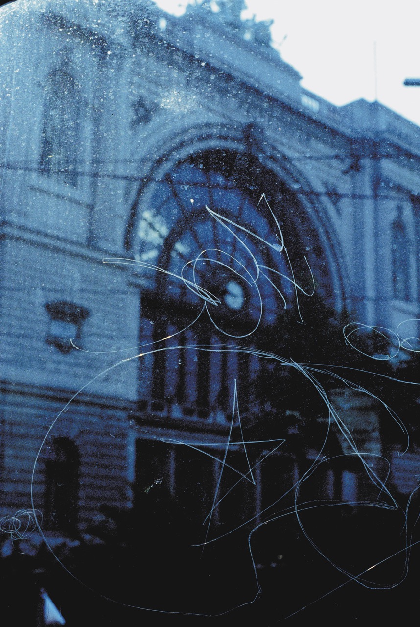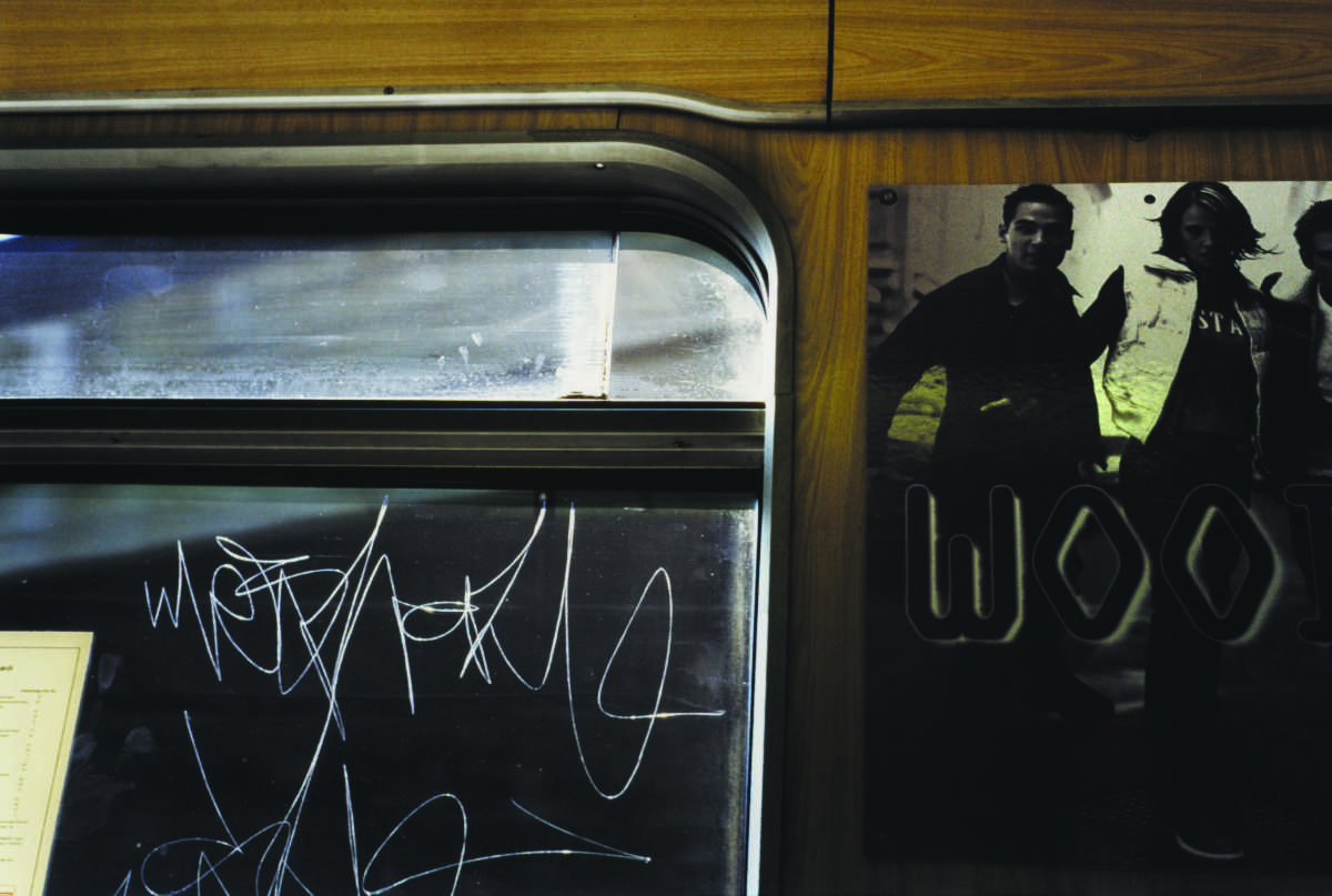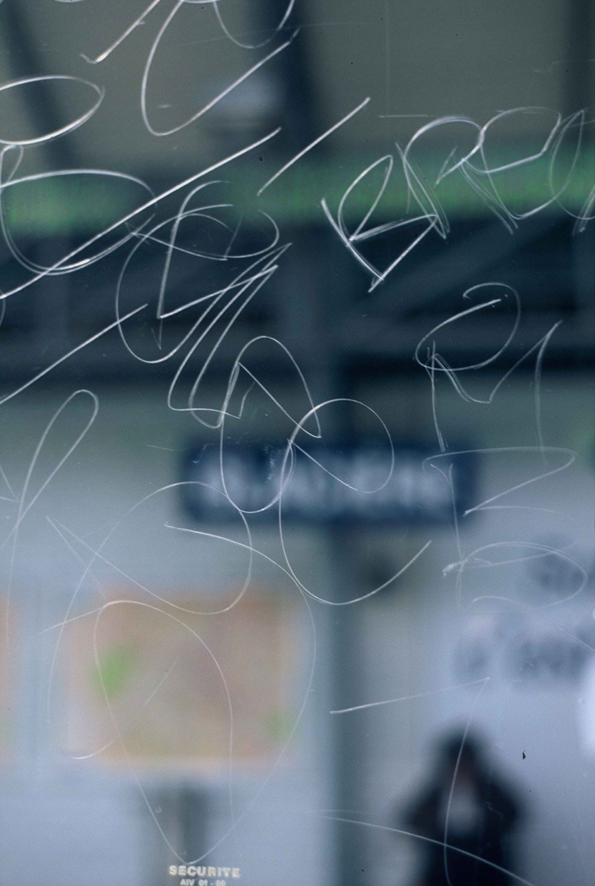 Existentmale addresses the phenomenon of the use of public transport windows as communicative displays of scratched tags.